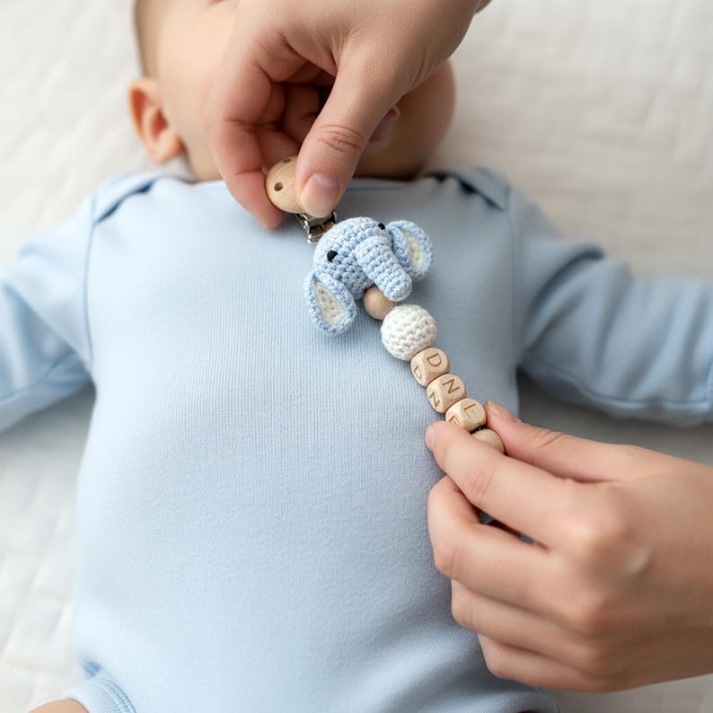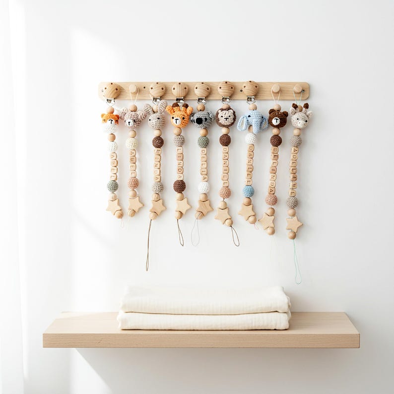 Make every moment with your little one extra special with our Personalized Pacifier Clip with Crochet Animal. Crafted with care, this charming pacifier clip features a delightful crochet animal and a custom wooden name tag, making it an ideal newborn gift for baby showers, birthdays, or just a sweet surprise. The soft and secure clip keeps pacifiers and toys within easy reach, while the crochet animal adds a cute touch to any baby outfit.